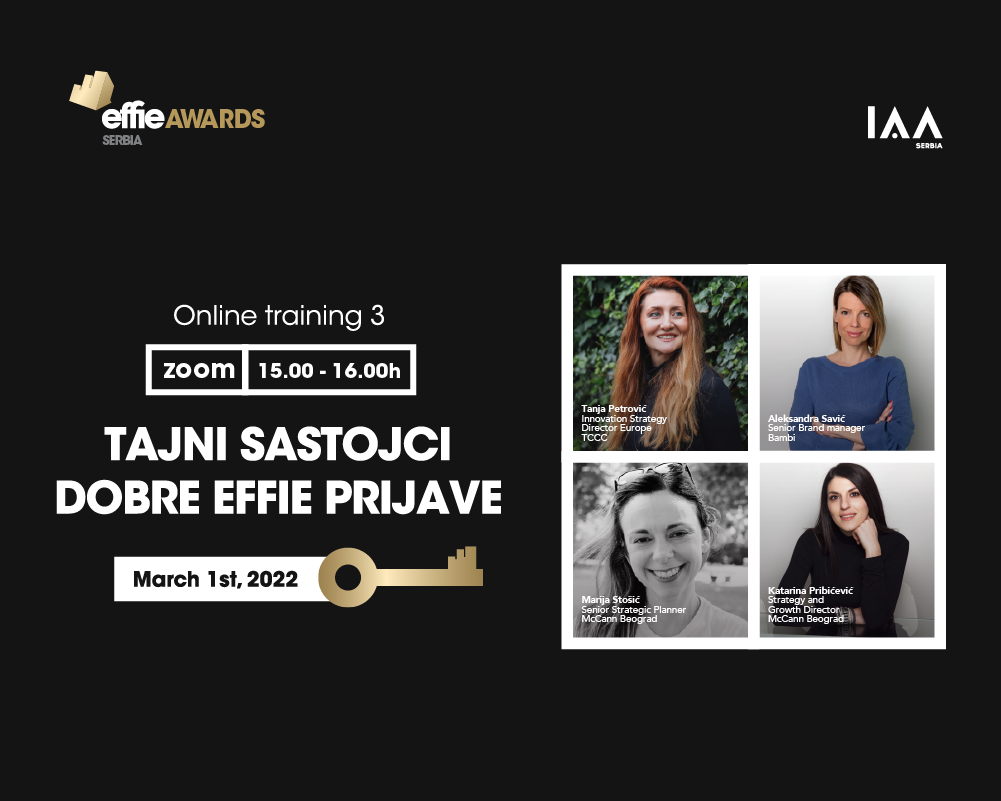 IAA Srbija 1. marta u 15h organizuje treći trening u okviru ovogodišnjeg Effie festivala. Sadržaj je namenjen široj stručnoj javnosti, a u ulozi predavača se pojavljuju predstavnici kompanija i agencija koje su osvojile najveći broj Effie trofeja u Srbiji. Prema rečima organizatora, dobar deo prijava na Effie takmičenju je visokog kvaliteta, ali i dalje postoji prostor za njihovo unapređenje, zbog čega je i odlučeno da se ove godine organizuje niz edukativnih predavanja.